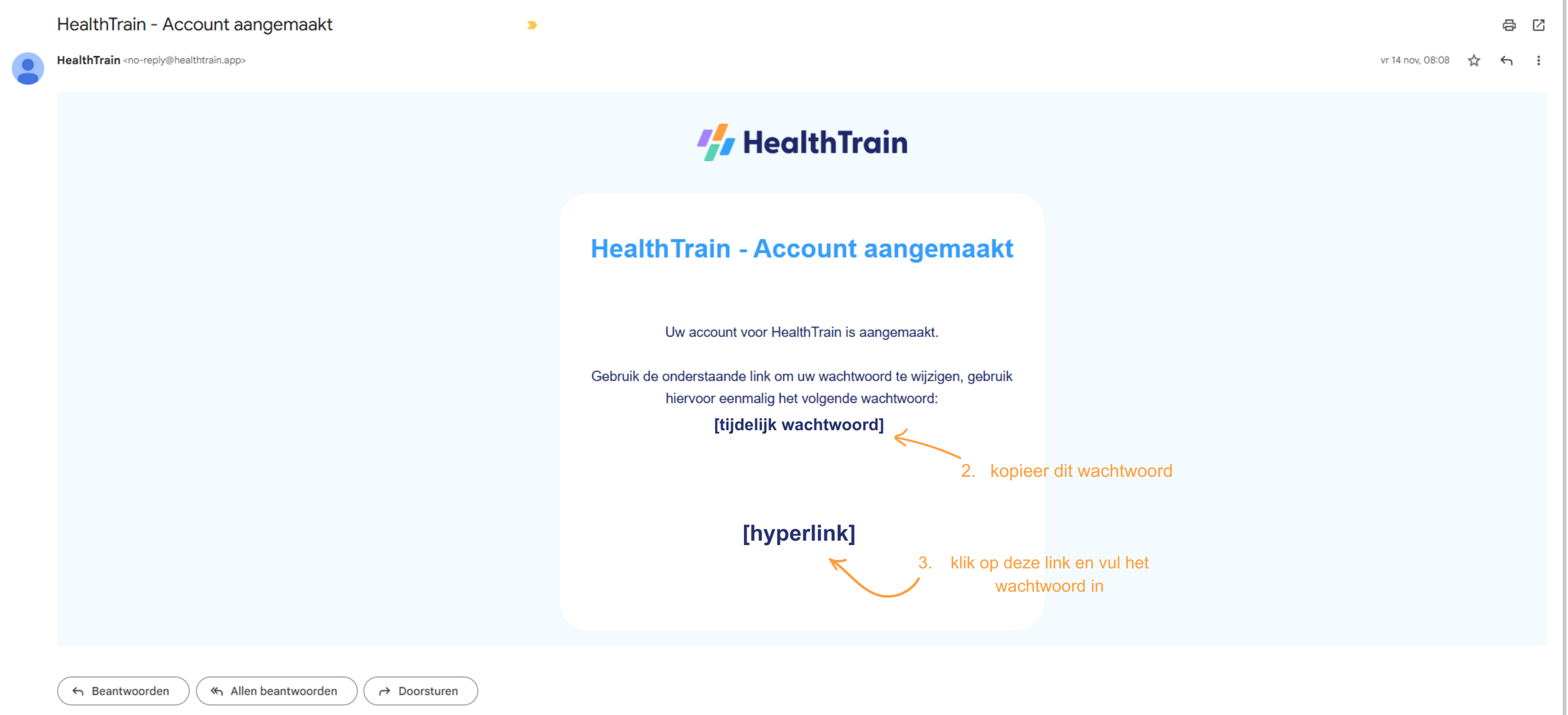 - Zoek in je e-mailbox naar een e-mail met onderwerp "HealthTrain - Account aangemaakt"